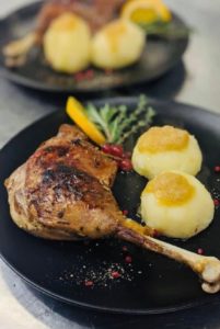 Genießen Sie Ihren traditionellen Gänsebraten mit hausgemachten Klößen, Maronen, Rosenkohl und Sauce im 2- oder 4-Gang Menü bei uns im Restaurant oder gemütlich zu Hause. Einfach anrufen und vorbestellen (min.48Std. vorher).